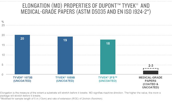 Tyvek® est un matériau d'emballage extrêmement souple qui ne se perfore et ne se déchire pas aussi facilement que les papiers pour l'emballage médical. Cette résilience, couplée à la robustesse intrinsèque de Tyvek®, garantit un fonctionnement sans incident ou panne majeure résultant de ruptures sur les lignes d'emballage par formage-remplissage-scellage.