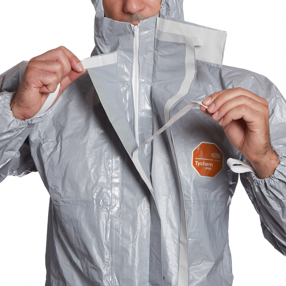 DuPont™ Tychem® 6000 F Gris. Combinaison à cagoule. Disponible en gris pour les besoins de discrétion, tailles SM à 5X. Elastiques autour du visage, aux poignets, à la taille et aux chevilles pour un ajustement optimal, le passe-pouce elastiqué empêche la manche de remonter. Rabat auto-adhésif sur le menton pour ajustement optimal autour du masque respiratoire.